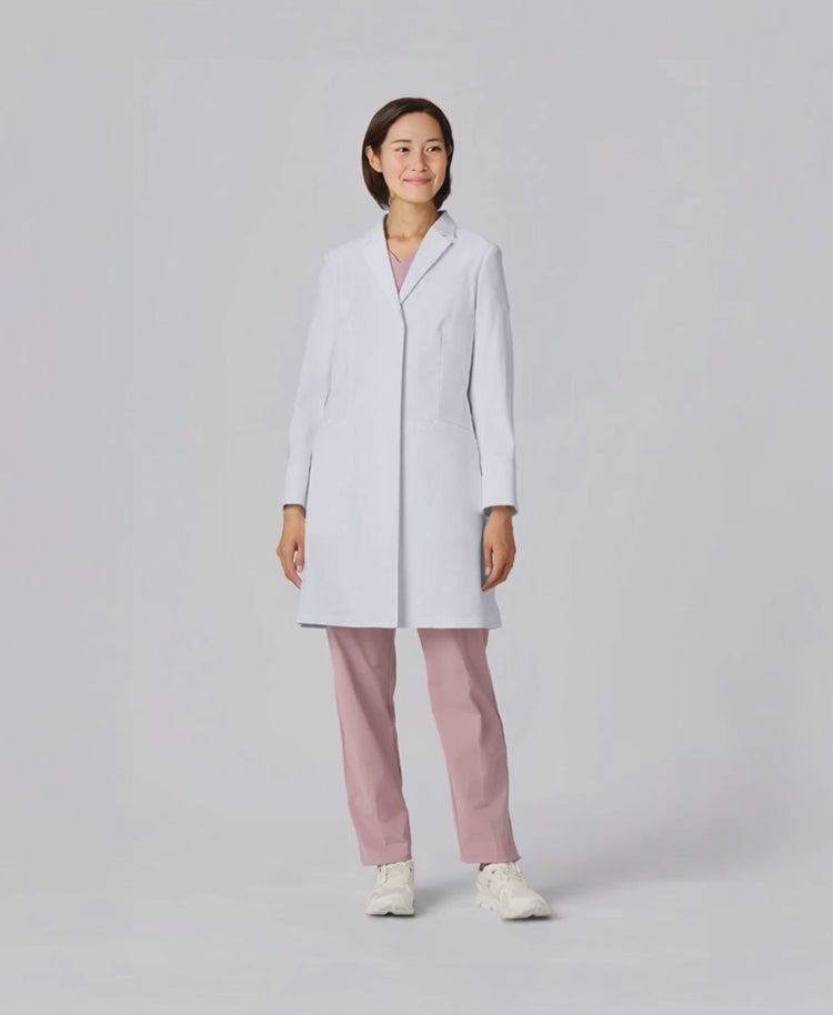 輕型系列的女式白大衣有兩種類型。短版波浪襬醫師袍的輪廓是下擺展開較大,整體柔和的印象;而輕盈醫師袍下擺略微平展,整體更為優雅的印象。